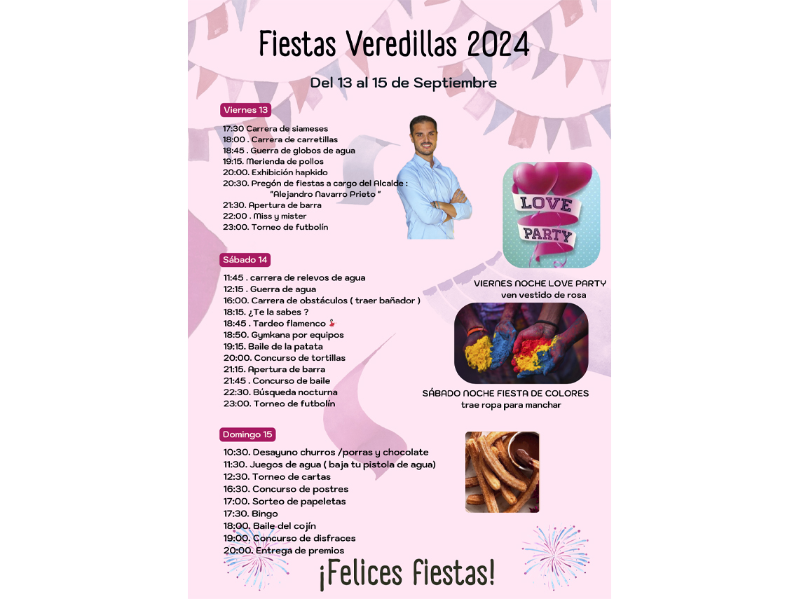 Torrejón de Ardoz, 13 de septiembre de 2024. El pregón a cargo del alcalde, Alejandro Navarro Prieto, dará el pistoletazo a los festejos de los tres barrios, comenzando a las 20:30 horas por Veredillas. Pero antes, contarán con múltiples actividades, como las carreras de siameses, carretillas, guerra de globos de agua, merienda de los pollos y exhibición de hapkido. A su término, las fiestas continuarán con la elección de Miss y Mister y un torneo de futbolín. Además, se podrá disfrutar de la Love Party en la que hay que ir vestido de rosa. La jornada de mañana sábado, 14 de septiembre, contará con guerra de agua, carrera de obstáculos, tardeo flamenco, baile de la patata y concurso de tortilla y baile y fiesta de colores, a la que hay que traer ropa para manchar, entre otras actividades. Ya el domingo habrá desayuno con churros y porras con chocolate, juegos de agua, torneo de cartas y concurso de postres, además de bingo, el baile del cojín y concurso de disfraces.