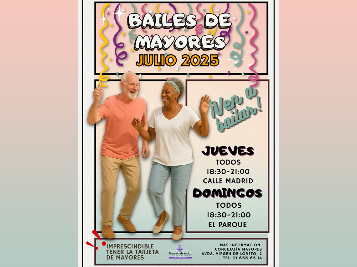 Los centros de mayores de la calle Madrid, los jueves, y El Parque, los domingos, ofrecen Bailes de Mayores con entrada gratuita durante el mes de julio y para acceder sólo es imprescindible tener la tarjeta de mayores de Torrejón de Ardoz.
