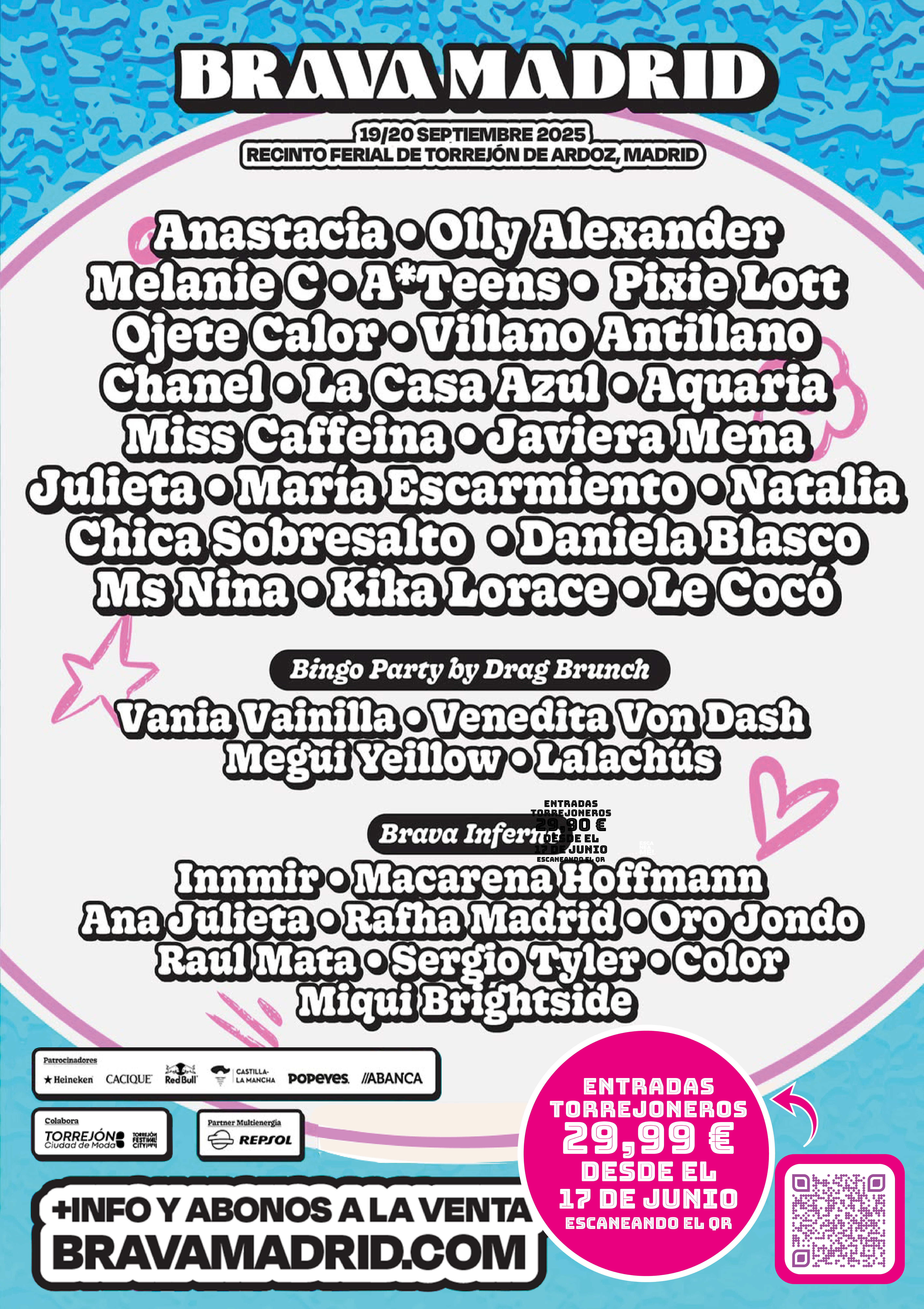 Torrejón de Ardoz, 16 de junio de 2025. Brava Madrid contará con el pop de la afamada cantante norteamericana Anastacia, del británico Olly Alexander y de las eurovisivas Chanel y Daniela Blasco, con la referencia internacional urbana de Villano Antillano, con el indie de Miss Caffeína y La Casa Azul, o entre otros con el humor irreverente de Ojete Calor, todo ello animado por Lalachús y la Bingo Party con afamadas Drag Queens.
