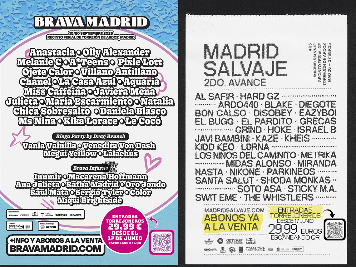 Mañana, martes, 17 de junio, se ponen a la venta las entradas con descuento para torrejoneros, a un precio de 29,99 euros, para los festivales de música Brava Madrid y Madrid Salvaje. Las entradas con descuento para torrejoneros para los festivales Brava Madrid se podrán comprar a través de este enlace https://www.enterticket.es/eventos/brava-madrid-2025-torrejon-423832 y para Madrid Salvaje a través del siguiente https://www.enterticket.es/eventos/madrid-salvaje-2025-torrejon-504956 Ambos festivales tendrán lugar en septiembre en el Recinto Ferial. Brava Madrid los días 19 y 20 y Madrid Salvaje los días 26 y 27. “Torrejón Ciudad de Moda” se consolida al acoger tres prestigiosos festivales musicales: Brava Madrid, Madrid Salvaje y elrow Town, que tuvo lugar el pasado 1 de mayo, todos ellos comprometidos con la sostenibilidad y concienciados con minimizar el impacto medioambiental y las afecciones a la comunidad local.