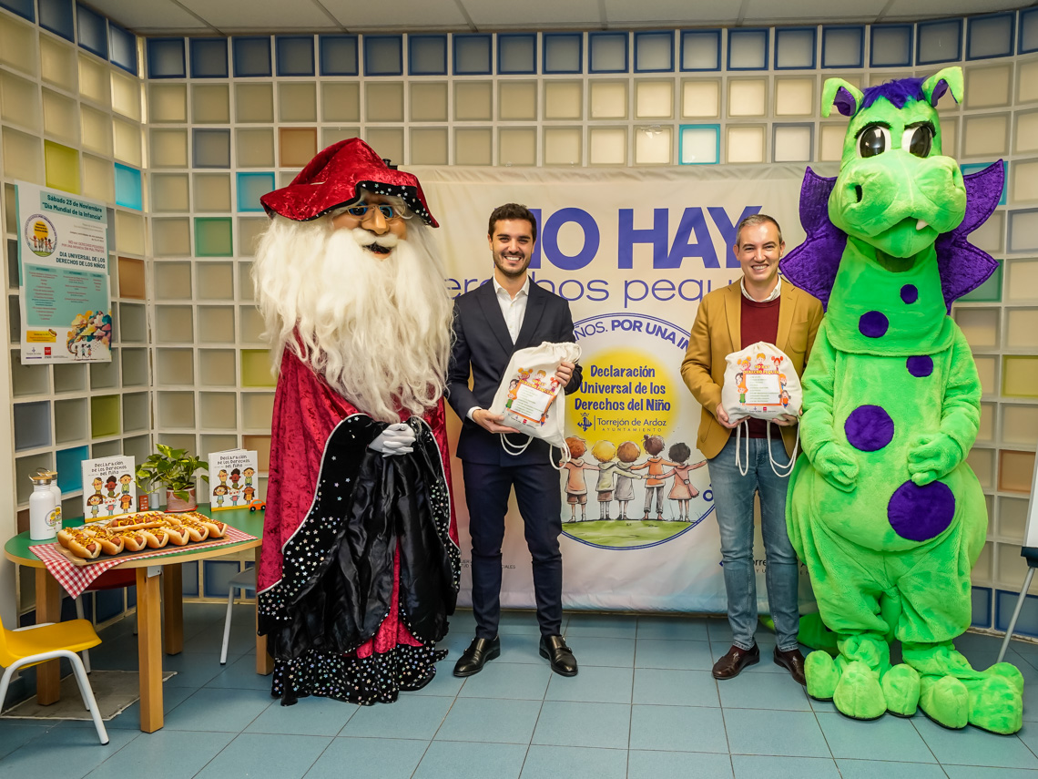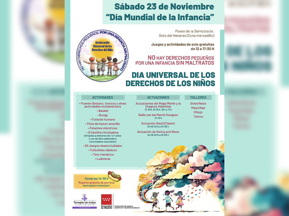 Torrejón de Ardoz celebrará este sábado, 23 noviembre, en el Paseo de la Democracia, el Día de la Infancia con numerosas actividades gratuitas desde las 12:00 a las 17:30 horas. Entre ellas, habrá castillos hinchables, futbolín humano, pista de humor amarillo, ludoteca, toro mecánico, entre otras muchas actividades, además de actuaciones, talleres y reparto gratuito de perritos a partir de las 14:30 horas, hasta agotar existencias. El alcalde, Alejandro Navarro, y el concejal de Bienestar, Educación e Inmigración, Rubén Martínez, presentaron el pasado miércoles, en el Centro de Atención a la Infancia, el divertido programa para los más pequeños.