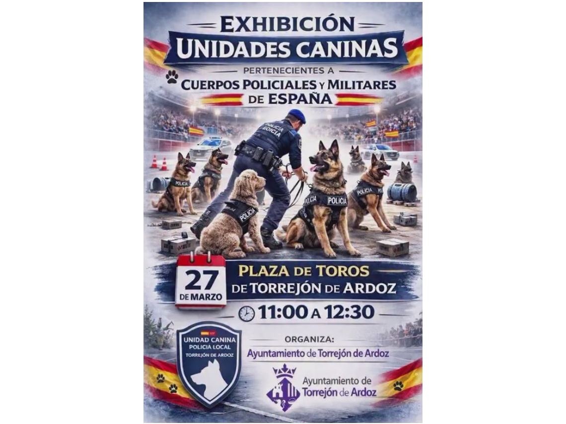 Torrejón de Ardoz, 27 de marzo de 2026. Durante la actividad, que se enmarca dentro de las I Jornadas Policiales y Militares de Guías Caninos, los asistentes podrán disfrutar de demostraciones en directo con unidades caninas de distintos cuerpos de seguridad y militares, como la Policía Local, Policías Autonómicas, Policía Nacional, Guardia Civil y Fuerzas Armadas. Además, contará con entrega de premios y diplomas.