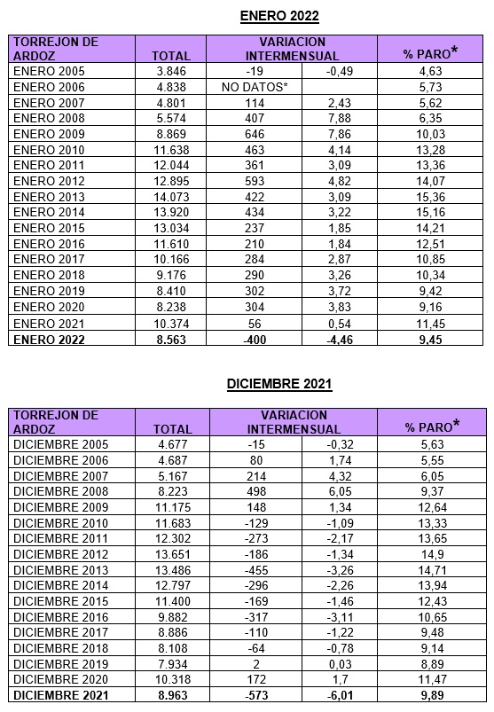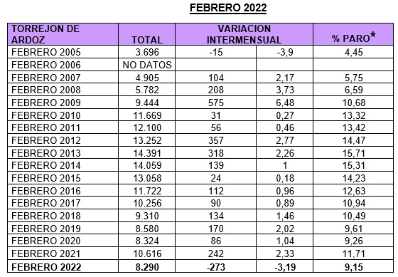 El desempleo en Torrejón de Ardoz registra por cuarto mes consecutivo el mejor dato de la historia y 1.718 personas han encontrado empleo en la ciudad en los últimos cuatro meses. Así, en febrero de 2022, un total de 273 vecinos dejaron las listas de desempleo, siendo este mes el mejor de la serie histórica desde que se contabiliza el paro en la ciudad. Además, en noviembre de 2021 el número de desempleados en Torrejón bajó en 472 personas, en diciembre de 2021 en 573, y en enero de 2022 el paro descendió en 400 vecinos siendo también los mejores datos de la serie histórica. En el último año, desde febrero de 2021 el paro en la ciudad ha descendido en 2.326 vecinos.