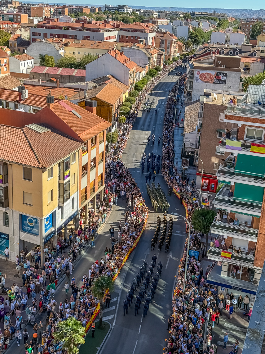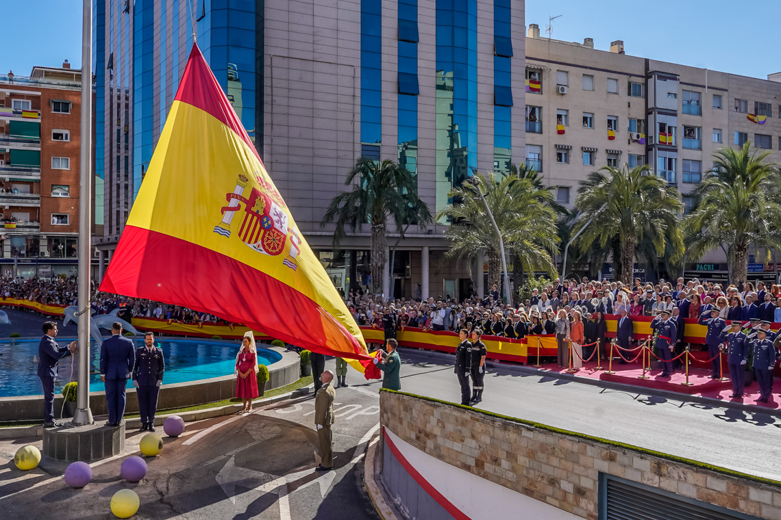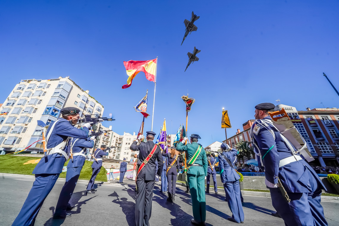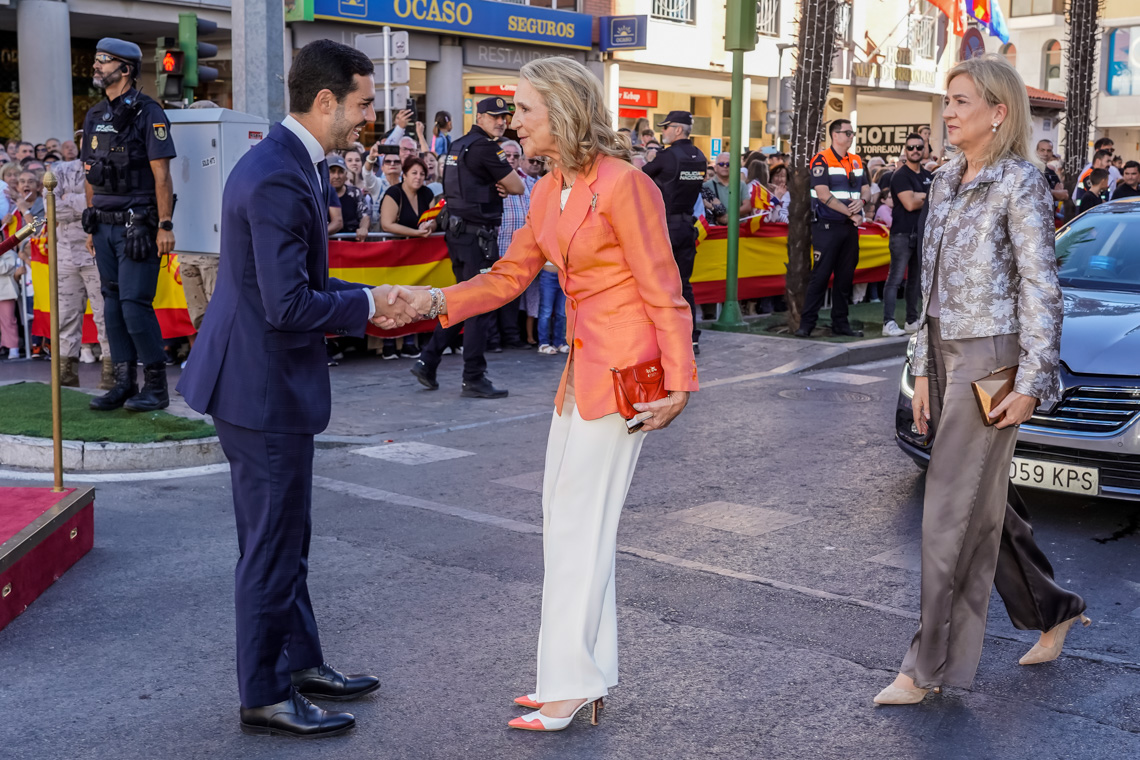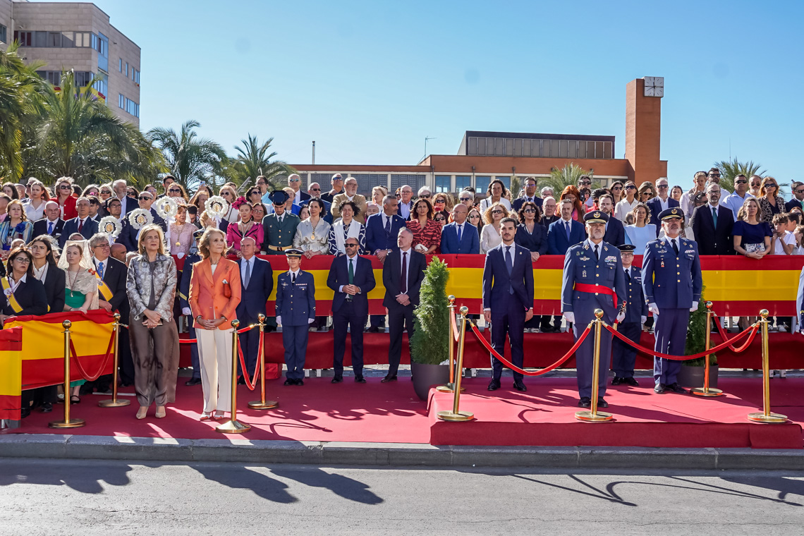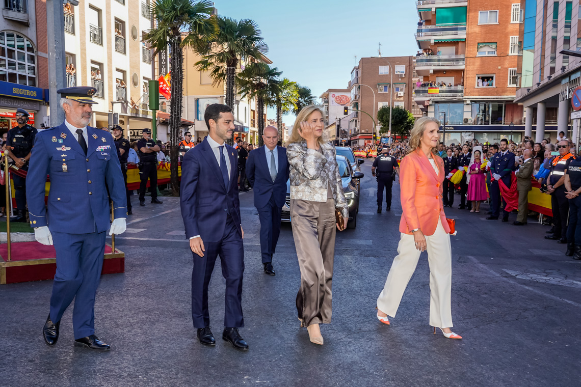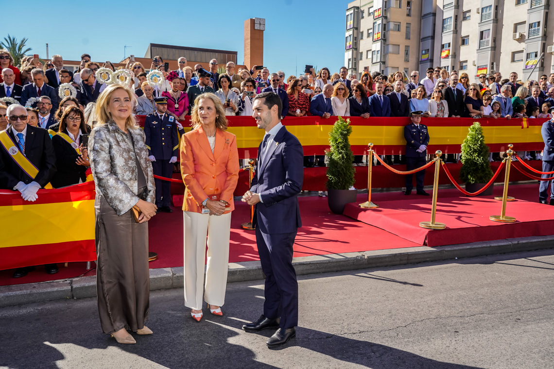 Torrejón de Ardoz, 6 de octubre de 2025. El Homenaje a la Bandera se confirmó como uno de los mejores de la Comunidad de Madrid y contó con la presencia de las infantas Elena y Cristina que hicieron la ofrenda a los caídos en un emotivo acto y desfile militar que debido al fuerte viento no pudo contar con la participación de la Patrulla Acrobática de Paracaidismo del Ejército del Aire, pero sí con una importante representación de nuestras Fuerzas Armadas, así como de las Fuerzas y Cuerpos de Seguridad del Estado.