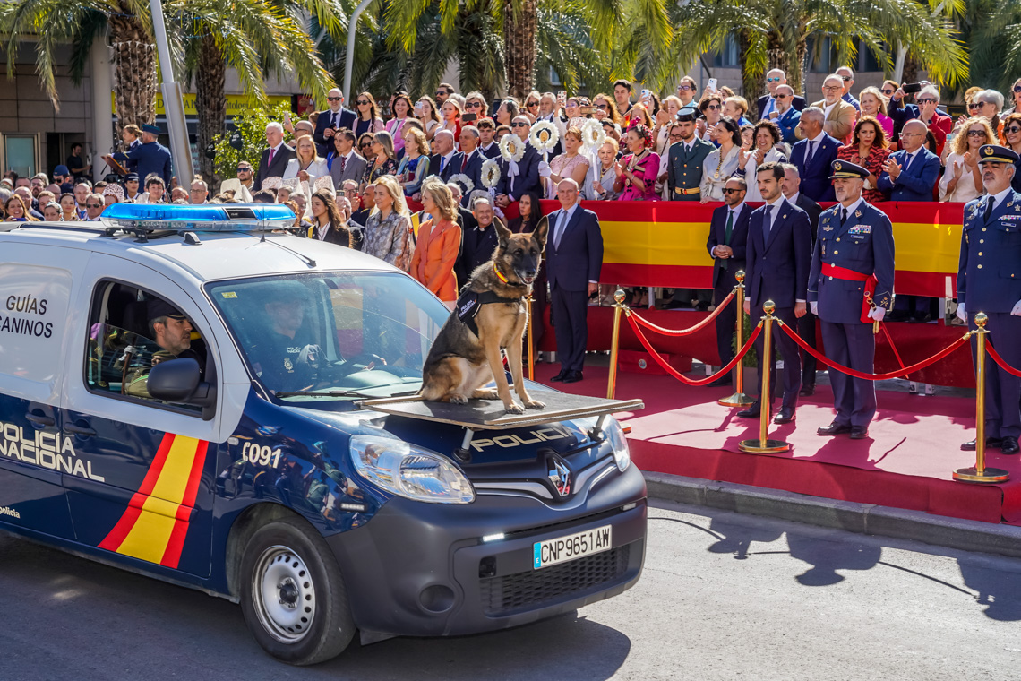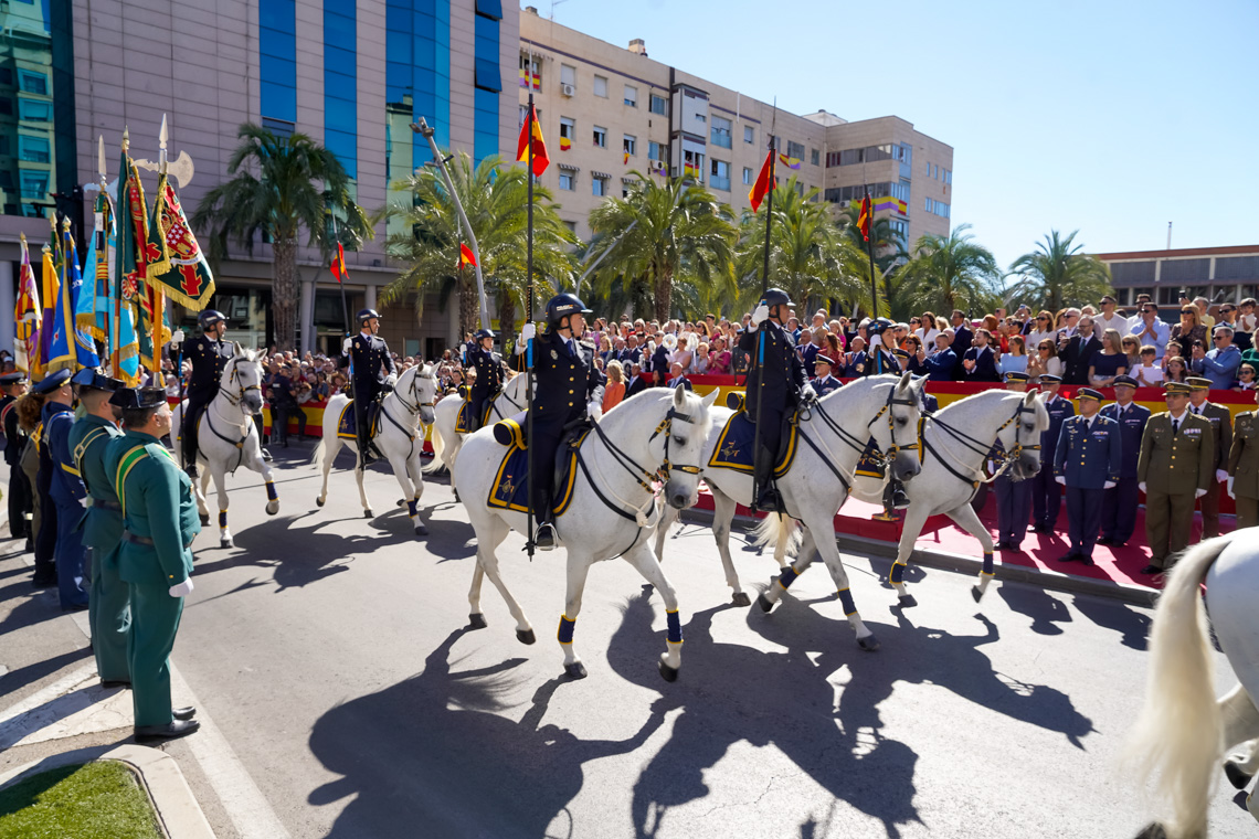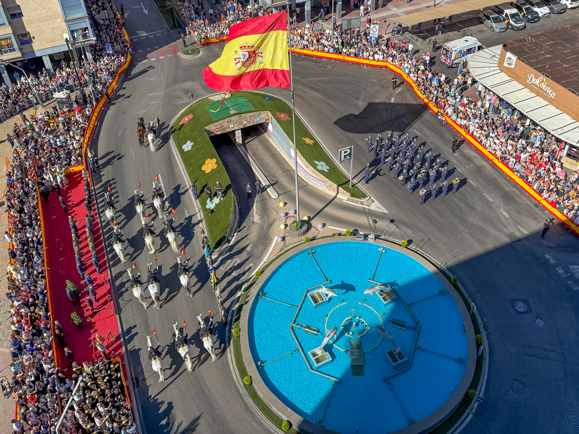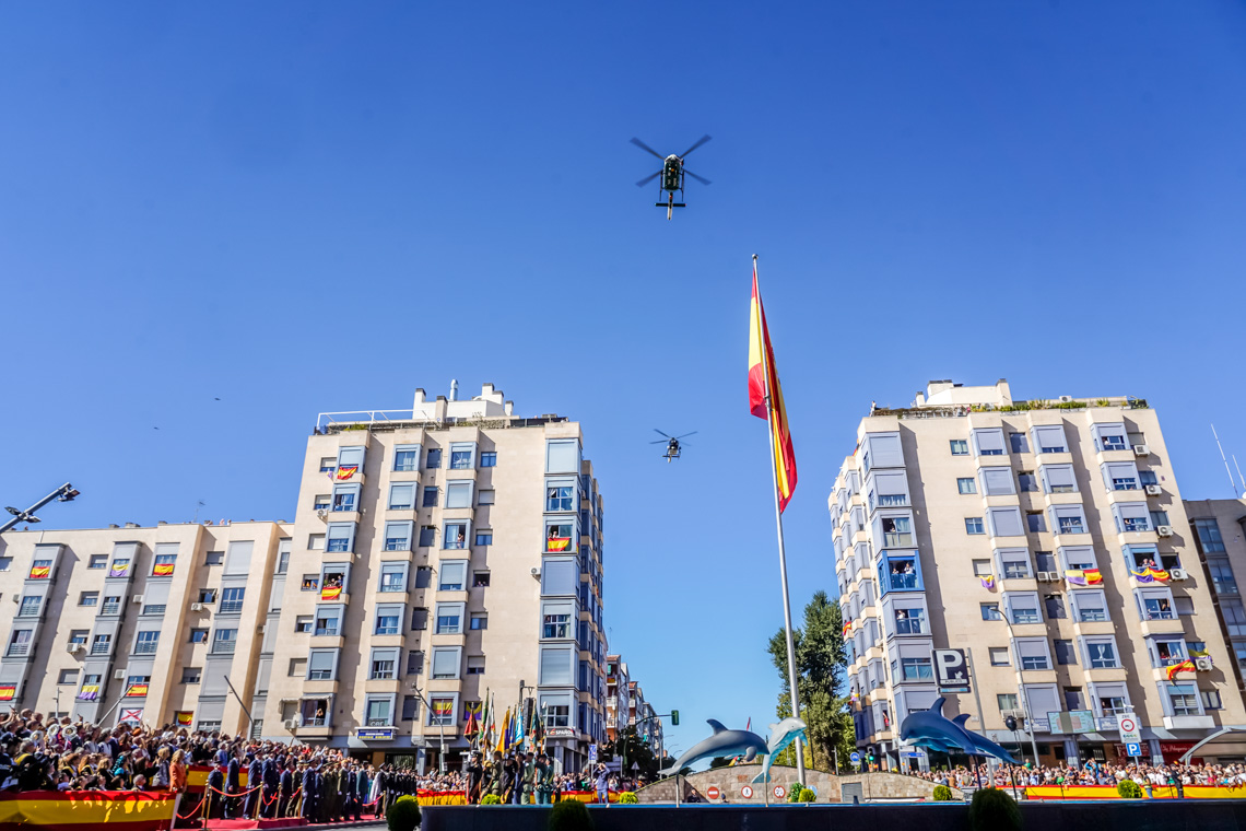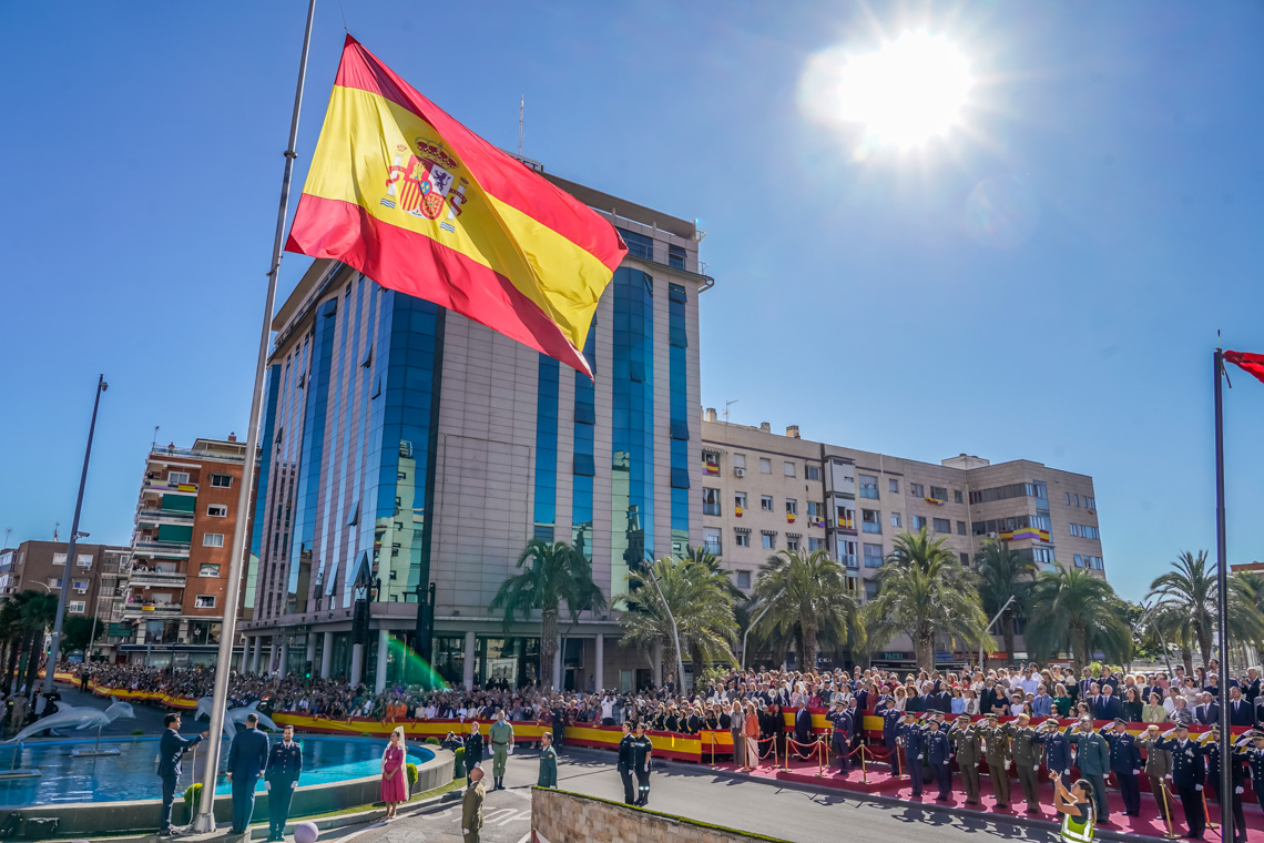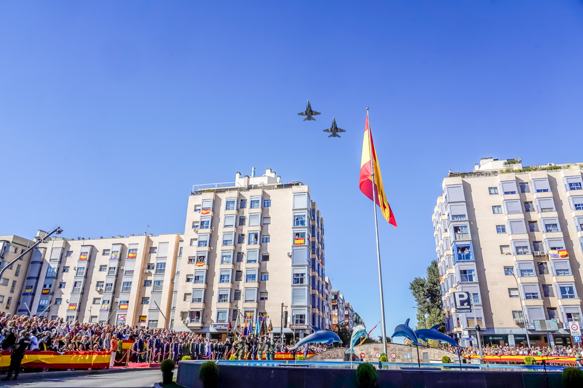 Torrejón de Ardoz, 6 de octubre de 2025. El Homenaje a la Bandera se confirmó como uno de los mejores de la Comunidad de Madrid y contó con la presencia de las infantas Elena y Cristina que hicieron la ofrenda a los caídos en un emotivo acto y desfile militar que debido al fuerte viento no pudo contar con la participación de la Patrulla Acrobática de Paracaidismo del Ejército del Aire, pero sí con una importante representación de nuestras Fuerzas Armadas, así como de las Fuerzas y Cuerpos de Seguridad del Estado.