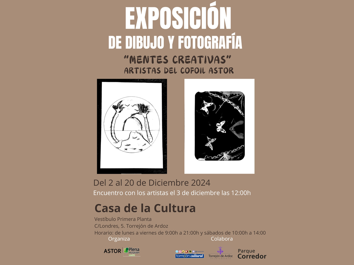 Torrejón de Ardoz continúa ofreciendo las mejores exposiciones, que se pueden disfrutar de forma gratuita. Así, la Casa de la Cultura, acoge la exposición de dibujo y fotografía “Mentes creativas”, de artistas del Cofoil Astor, que se podrá visitar hasta el próximo 20 de diciembre, de lunes a viernes, en horario de 9:00 a 21:00 horas y sábados de 9:00 a 14:00 horas.