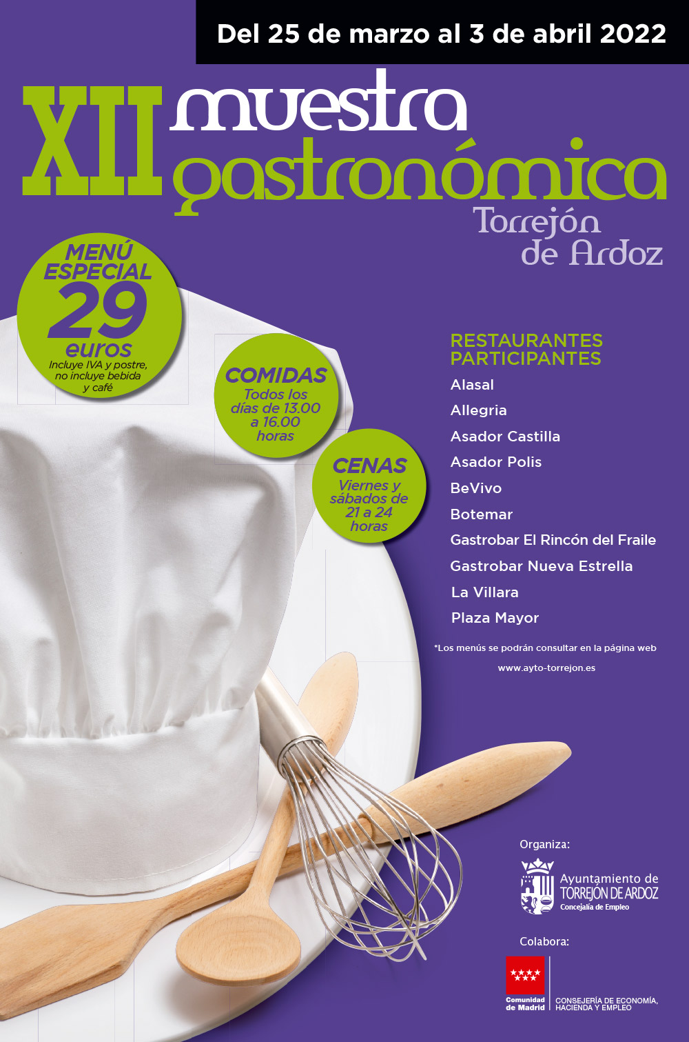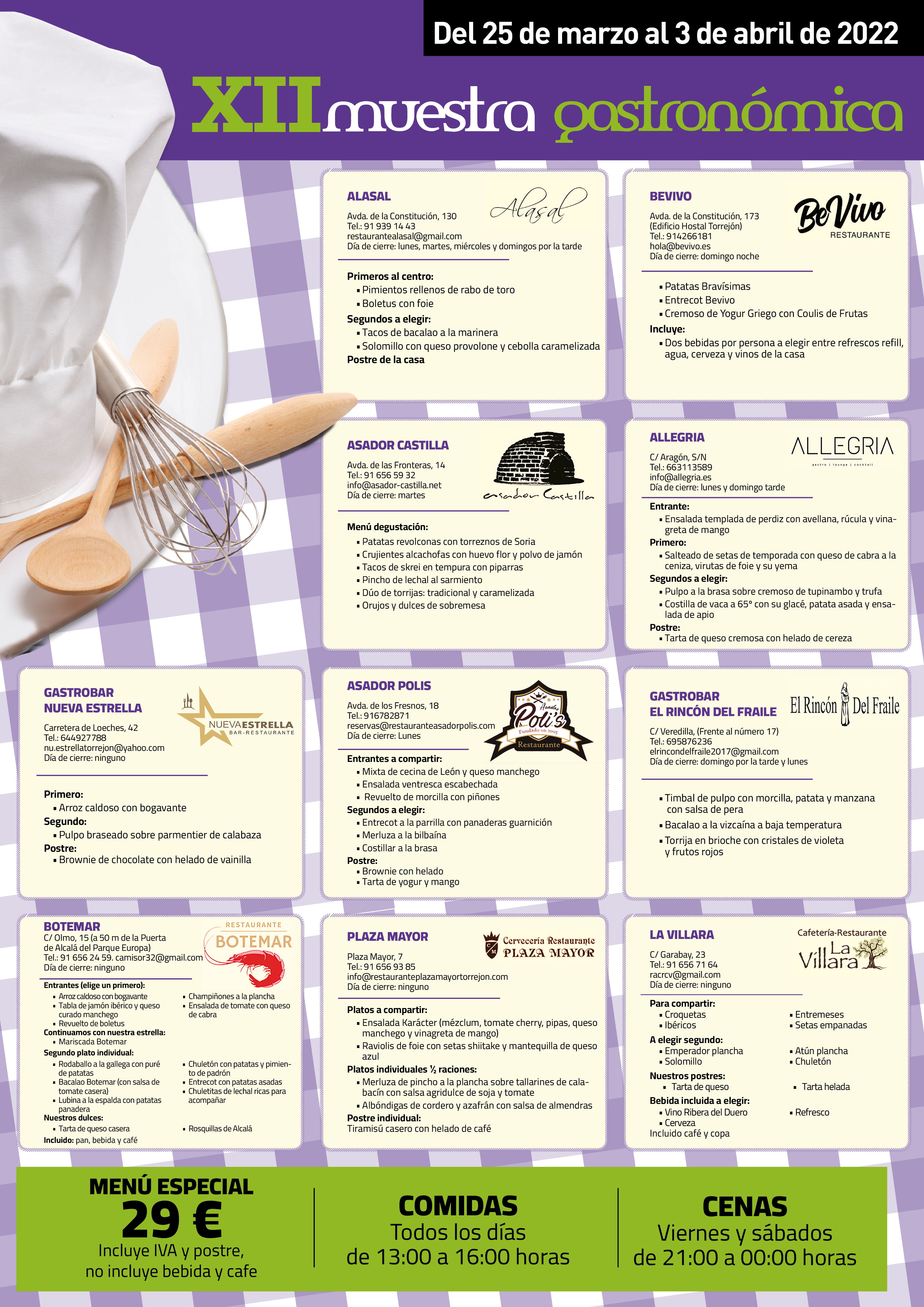 • Los restaurantes que participan en la XII Muestra Gastronómica de Torrejón son: Alasal, Allegria, Asador Castilla, Asador Poli´s, BeVivo, Botemar, Gastrobar, El Rincón del Fraile, Gastrobar Nueva Estrella, La Villara y Plaza Mayor