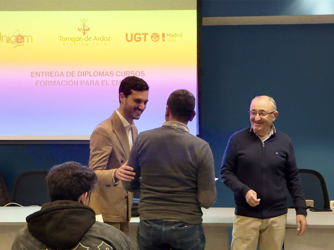 El alcalde, Alejandro Navarro Prieto, acompañado por el secretario general UGT-Madrid Unión Comarcal Este, Jesús La Roda, y la secretaria general de UNICEM, Carolina Santana, entregó ayer los diplomas correspondientes a los alumnos que han superado con éxito los cursos de “Operador de carretillas elevadoras” e “Introducción al diseño gráfico con software libre”, organizado, por el Ayuntamiento de Torrejón de Ardoz, UGT Madrid y la patronal UNICEM dentro de la Estrategia de Torrejón de Ardoz por el Empleo, diseñada con el objetivo de facilitar la inserción laboral de sus participantes.