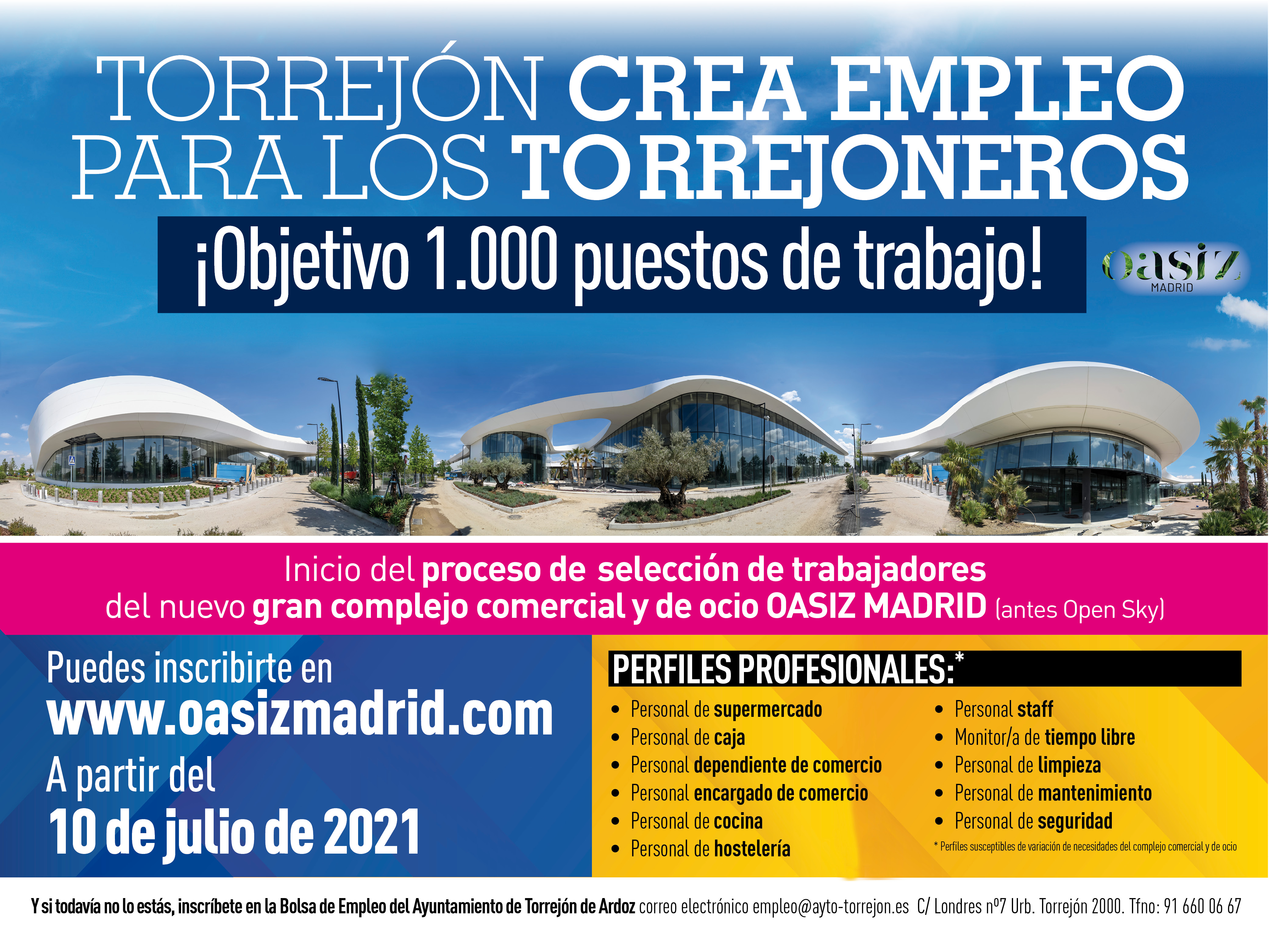 A partir de mañana 10 de julio se abre el plazo de inscripción para participar en el proceso de selección de trabajadores por parte de la empresa promotora del nuevo gran complejo comercial y de ocio Oasiz Madrid, antes Open Sky. Aquellos intereados interesados en optar a uno de estos puestos de trabajo pueden inscribirse a en www.oasizmadrid.com. El objetivo es impulsar la creación de 1.000 puestos de trabajo para los torrejoneros, a través de este gran complejo comercial y de ocio en Torrejón de Ardoz en el Polígono Casablanca, cuyas obras están finalizando.