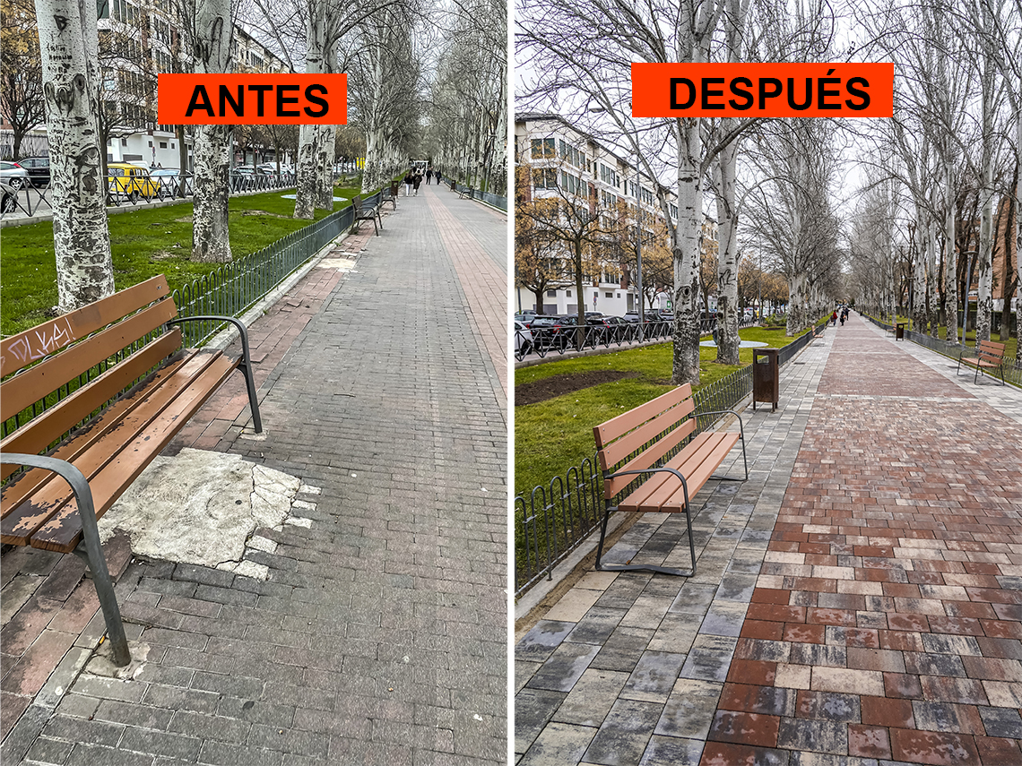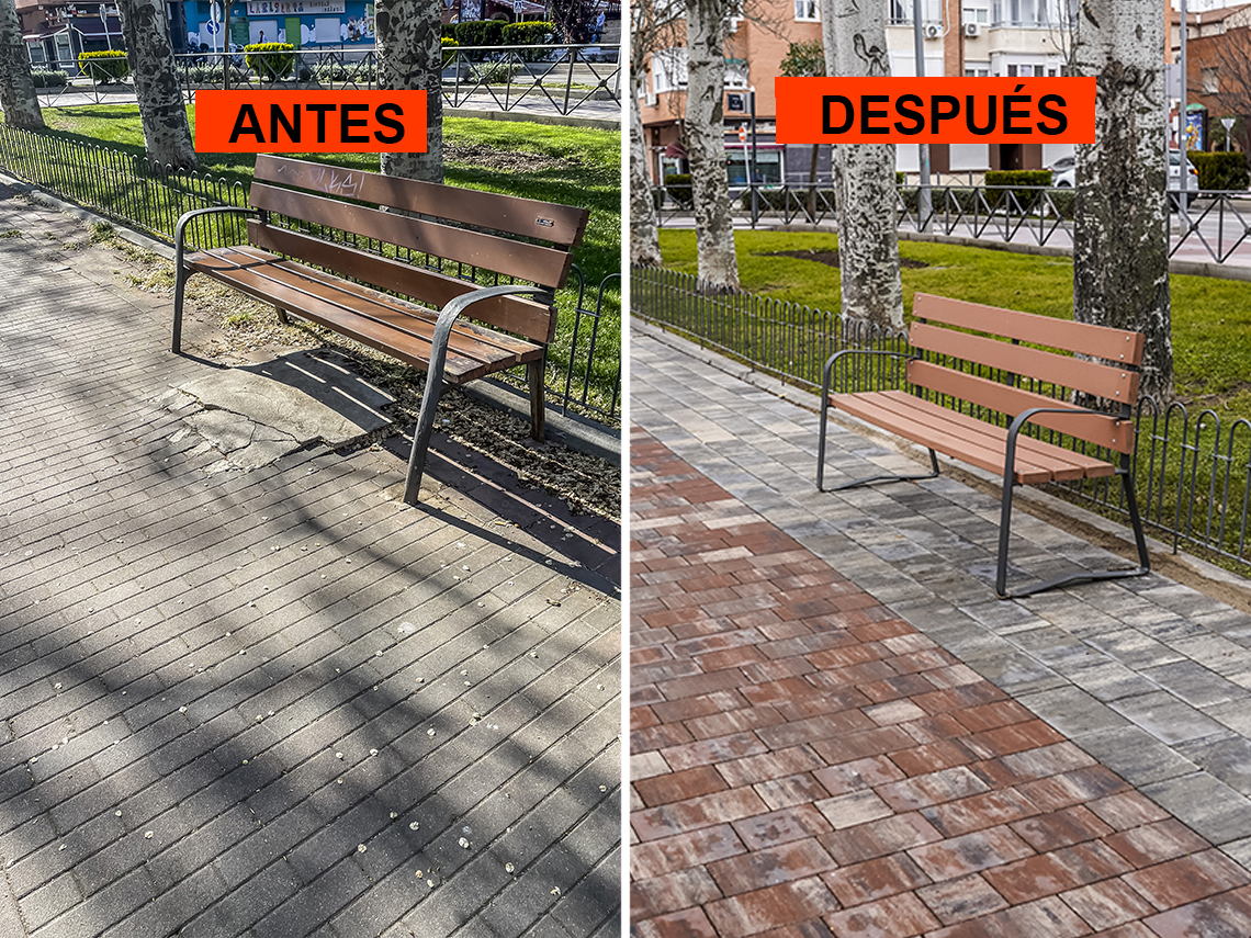 • Los trabajos han consistido en la remodelación de la acera de la avenida de Madrid paralela al Paseo de la Chopera entre las calles Turín y avenida Virgen de Loreto, reparando también los alcorques de los árboles que se encontraban levantados por el crecimiento de las raíces de los mismos, así como la reparación de las canalizaciones de alumbrado público y la instalación de baldosa antideslizante roja con cenefa gris