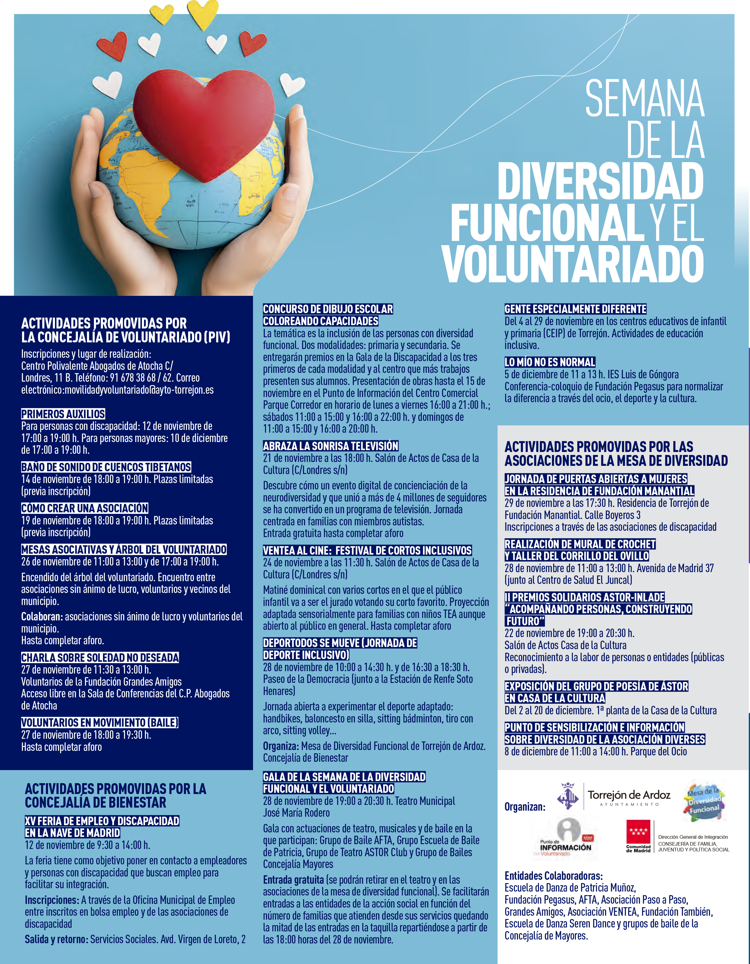 • Gala de la Semana de La Diversidad Funcional y el Voluntariado. La semana culminará el 28 de noviembre de 19:00 a 20:30 horas, en el Teatro Municipal José María Rodero con una emocionante gala, donde los miembros de asociaciones locales y algunos voluntarios mostrarán su talento en una presentación única y conmovedora. Contará con actuaciones de teatro, musicales y de baile en la que participan: Grupo de Baile AFTA, Grupo Escuela de Baile de Patricia Muñoz, Grupo de Teatro ASTOR Club y Grupo de Bailes Concejalía Mayores. Entrada gratuita. Se facilitarán invitaciones en taquilla a partir de las 18:00 horas del 28 de noviembre.