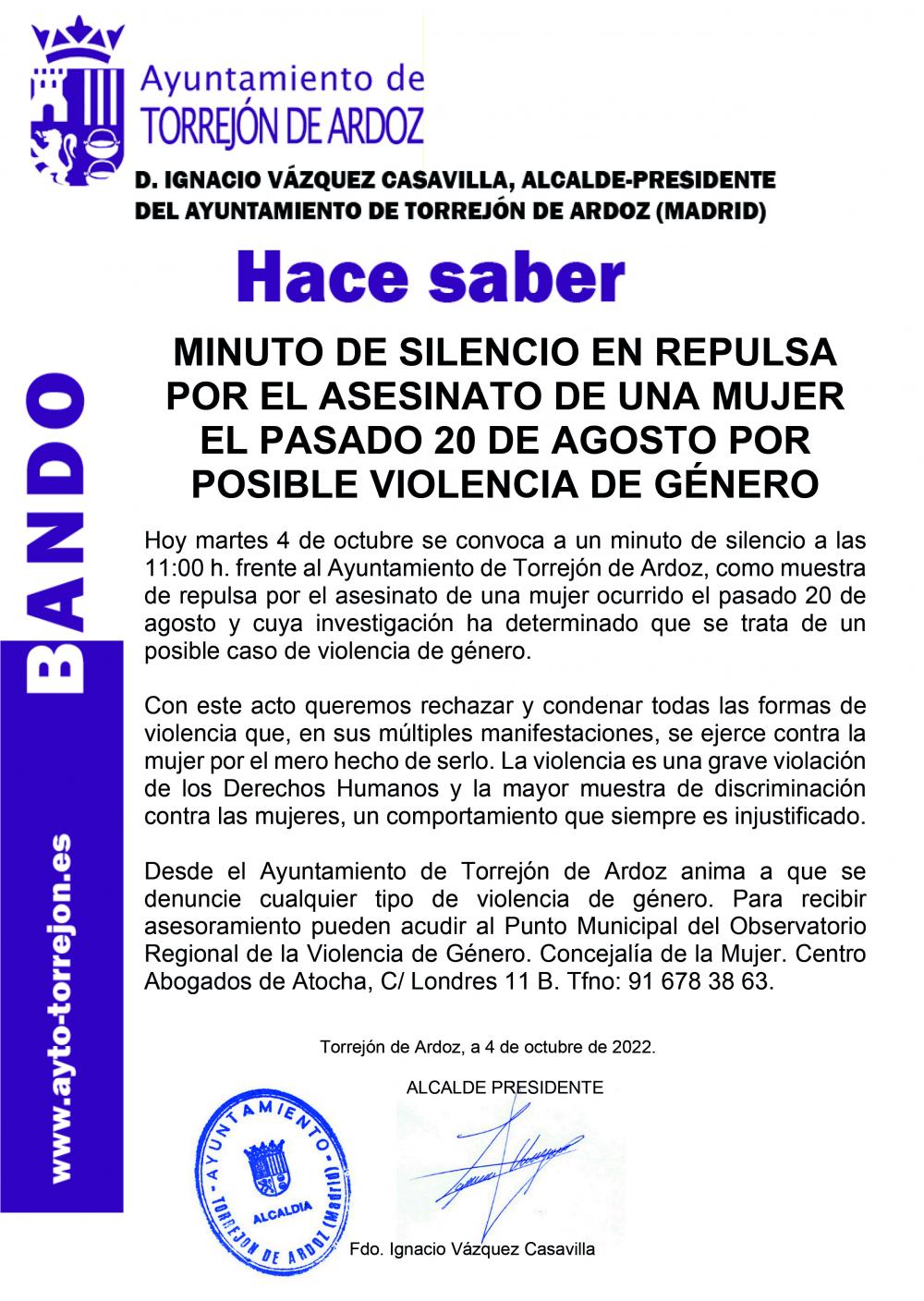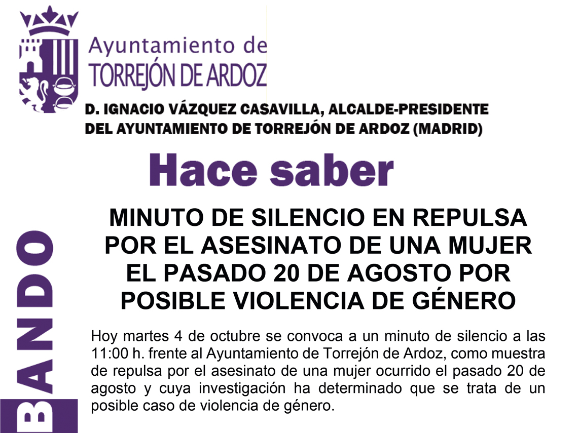 Hoy martes 4 de octubre se convoca a un minuto de silencio a las 11:00 h. frente al Ayuntamiento de Torrejón de Ardoz, como muestra de repulsa por el asesinato de una mujer ocurrido el pasado 20 de agosto y cuya investigación ha determinado que se trata de un posible caso de violencia de género.