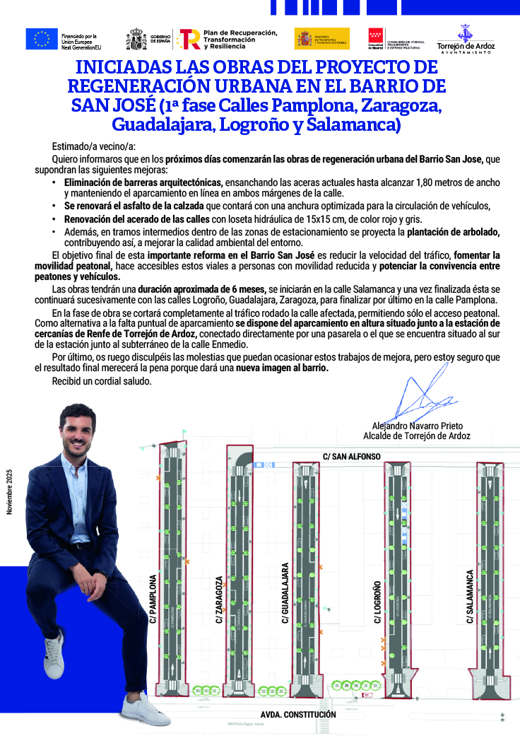 Se renuevan los barrios más tradicionales de Torrejón de Ardoz. Ya han comenzado las obras del Proyecto de Regeneración Urbana del Barrio San José que, en una 1ª fase, se realiza en las calles Pamplona, Zaragoza, Guadalajara, Logroño y Salamanca. El objetivo final de esta importante reforma es reducir la velocidad del tráfico, fomentar la movilidad peatonal, hacer accesibles estos viales a personas con movilidad reducida y potenciar la convivencia entre peatones y vehículos. Además de renaturalizar el barrio y aumentar la iluminación para mejorar la seguridad. También, se van a crear nuevas plazas de aparcamiento en la calle San Alfonso en el lugar que ahora ocupan algunas de las naves abandonadas, derribando éstas, tras el inminente acuerdo con la propiedad.