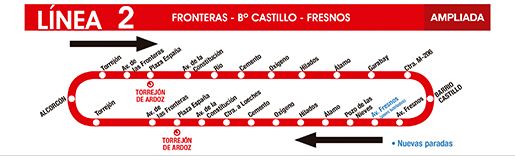 - Línea 2: L2 Fronteras – Barrio Castillo - Fresnos. Se ha creado una segunda parada dentro del mismo recorrido en la Av. de los Fresnos frente a los Pisos Tutelados.