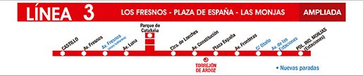 - Línea 3: L3 Los Fresnos – Plaza de España - Las Monjas. Se mantiene el recorrido y se amplía en el Polígono Industrial Las Monjas con paradas en la calle Otoño y Avenida de las Estaciones. Además se incorpora una segunda parada en Av. de los Fresnos, frente a los Pisos Tutelados.