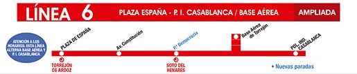 - Línea 6: L6 Plaza de España - P.I. Casablanca / Base Aérea. Se amplía el recorrido y esta línea parará en la Estación de Tren de Soto del Henares y en el Polígono Industrial Casablanca manteniendo el recorrido hasta la Base Aérea. Consulte los horarios porque esta línea alterna su finalización de trayecto.