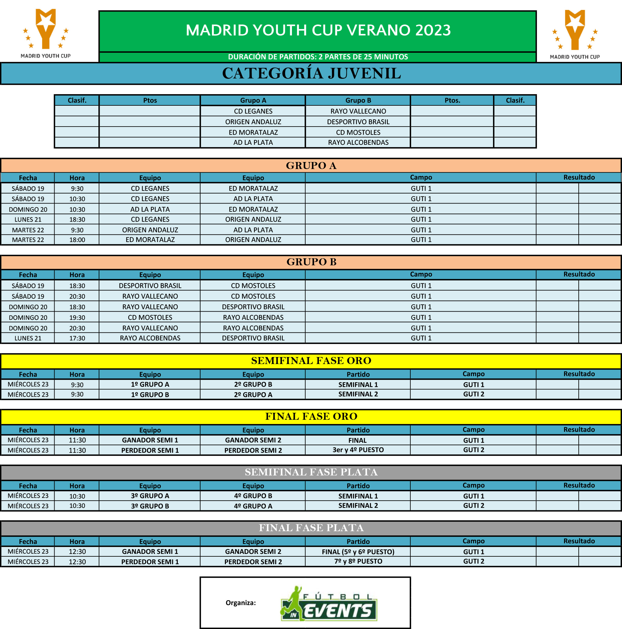Toda la información del torneo con los horarios de los partidos se puede ver en la web oficial http://summer.madridyouthcup.com/informacion/ y en la cuenta de Twitter https://twitter.com/MadridYouthCup