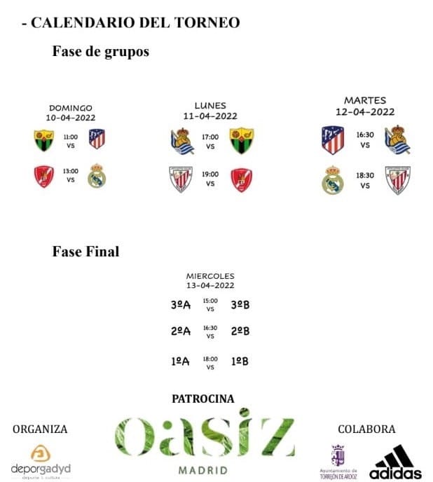 Torrejón de Ardoz será una de las ciudades de referencia en el fútbol de base durante esta Semana Santa. Del 10 al 13 de abril, el Campo de Fútbol Municipal Las Veredillas, acogerá el “Trofeo Oasiz” en el que participarán algunos de los mejores equipos de nuestro país de categoría infantil como son el Real Madrid, Atlético de Madrid, Athletic de Bilbao y Real Sociedad. Completan el cartel dos de las mejores canteras de la Comunidad de Madrid, con son la AD Torrejón CF y el Periso CF.