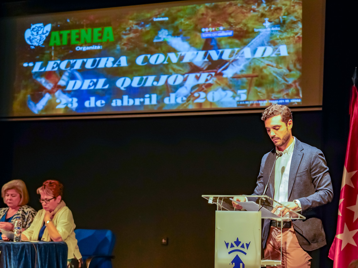 • El regidor torrejonero destacó que “siempre me ha parecido una gran idea este homenaje al texto más reconocido de nuestra lengua que surgió hace 23 años. Y, por ello, quisiera agradeceros el esfuerzo que hacéis la Asociación Cultural Atenea por llevar a cabo esta lectura ininterrumpida de El Quijote, que es ya una cita imprescindible en la cultura de Torrejón de Ardoz”