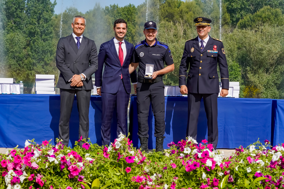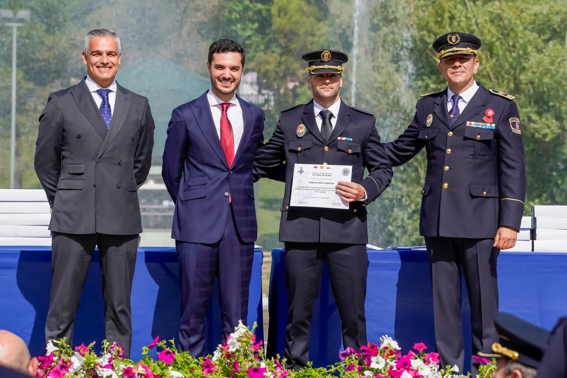 • Además, se entregó un reconocimiento a los policías que tuvieron actuaciones muy destacas el pasado año, recibiendo la Cruz al Mérito Profesional Distintivo Blanco, Álvaro Martinez Garcia, agente de la Policía Local, por su destacada intervención cuando estando fuera de servicio mientras paseaba observó una tentativa de homicidio y realizó una persecución junto a su perro en la que lograron detener al autor del delito. También recibió este reconocimiento Manuel Carballo Diaz, subinspector de la Policía Local, y Álvaro Barreiro Ortiz, agente de la Policía Local, que evitaron el suicidio de una persona que portaba un cuchillo con el que amenazaba con autolesionarse. En un momento de descuido lograron reducir a la persona quitándole el arma que portaba