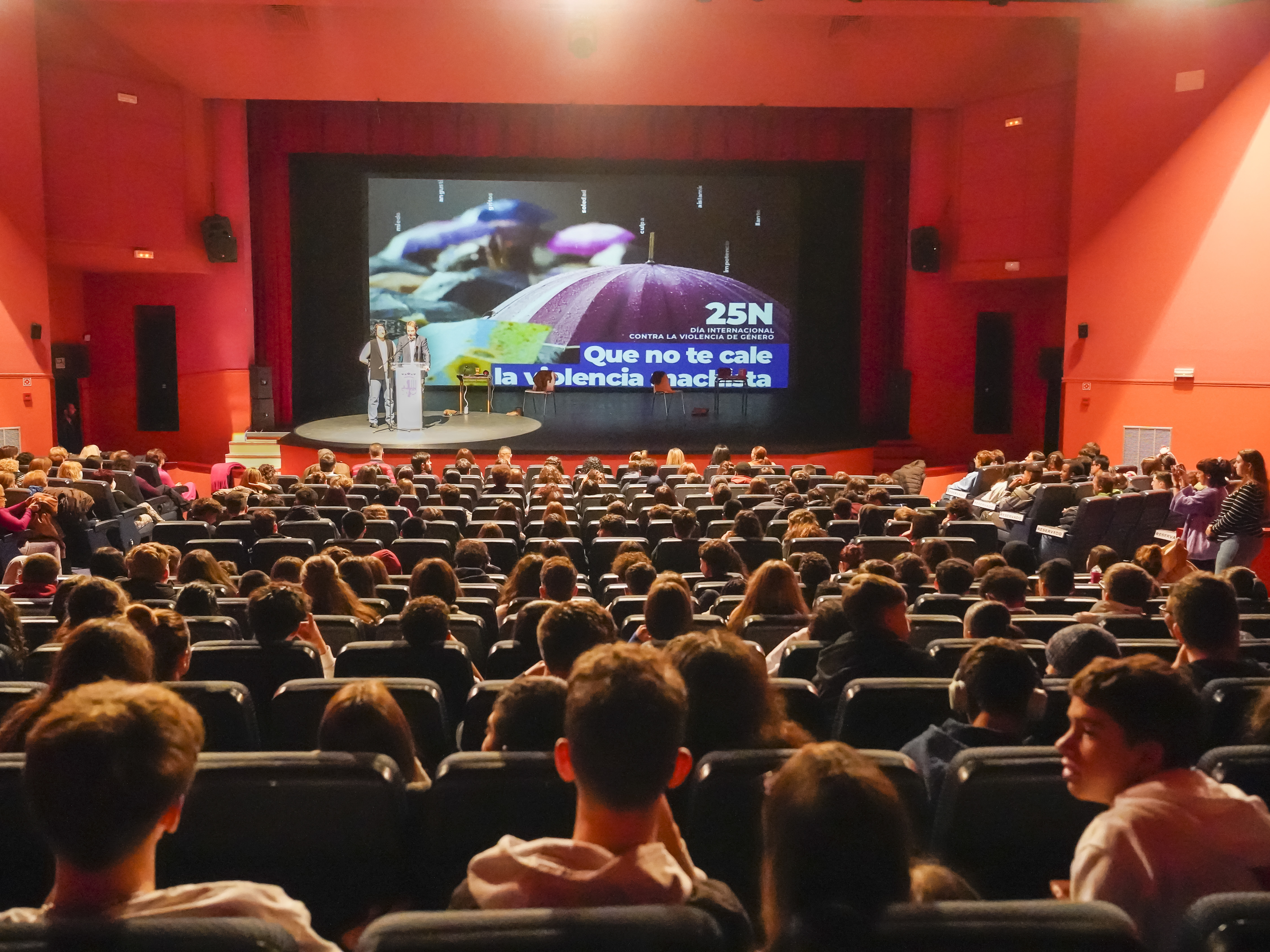 • Antes, en el Teatro Municipal José María Rodero, se llevó a cabo el Acto Institucional bajo el lema “Dale la vuelta al maltrato”, dirigido al alumnado de 3º de la ESO de los institutos de la ciudad en el que se proyectó un vídeo con todos los TikTok que han elaborado los estudiantes para dar visibilidad a un problema tan grave como es la violencia de género. Además, se representó una obra de teatro con diferentes sketches en los que se ha podido ver desde la más sutil de las violencias psicológicas, intento de aislamiento, control de relaciones sociales, redes sociales y móvil, hasta la violencias física o sexual. Cada escena ha tenido su contrapartida, en la que, con la participación del público, se ha reflejado el otro lado de un espejo en el que priman los buenos tratos, la igualdad y el respeto para ver que otra realidad es fácil de generar