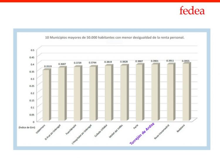 Torrejón de Ardoz se sitúa entre los municipios de España con menos desigualdad y mejor distribución de la riqueza, según el informe "Renta personal de los municipios españoles y su distribución" publicado por la prestigiosa Fundación de Estudios de Economía Aplicada (Fedea) en el que analiza la evolución de la desigualdad y la distribución de la renta personal en los municipios españoles entre 2011 y 2014.