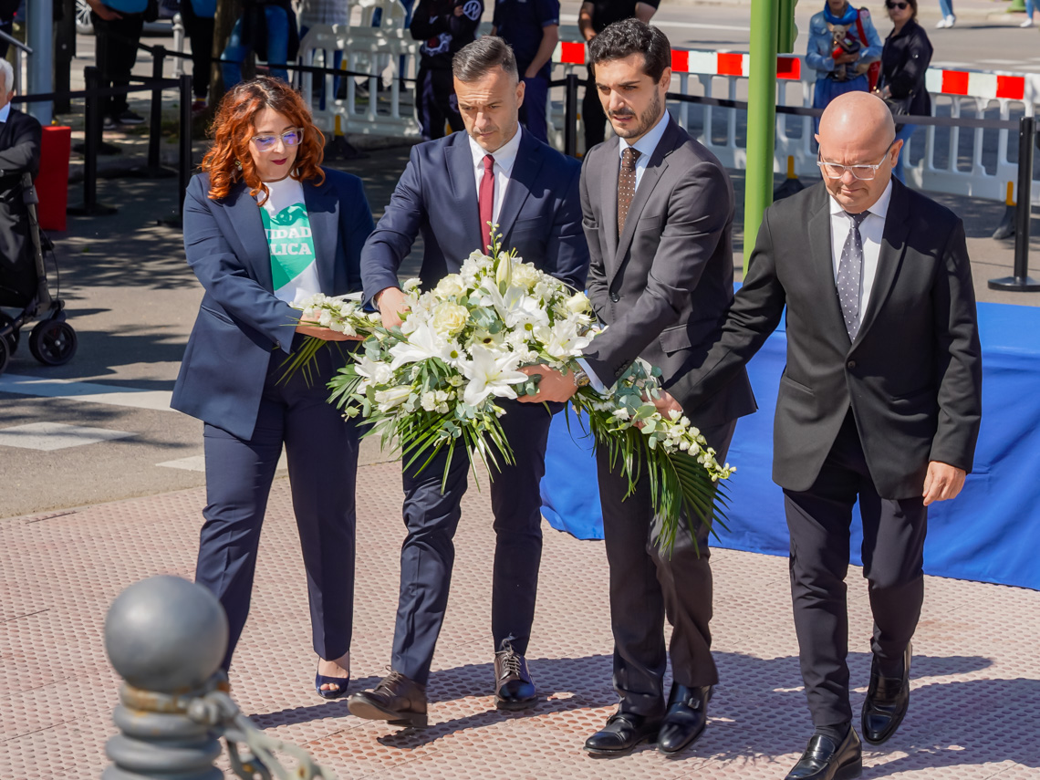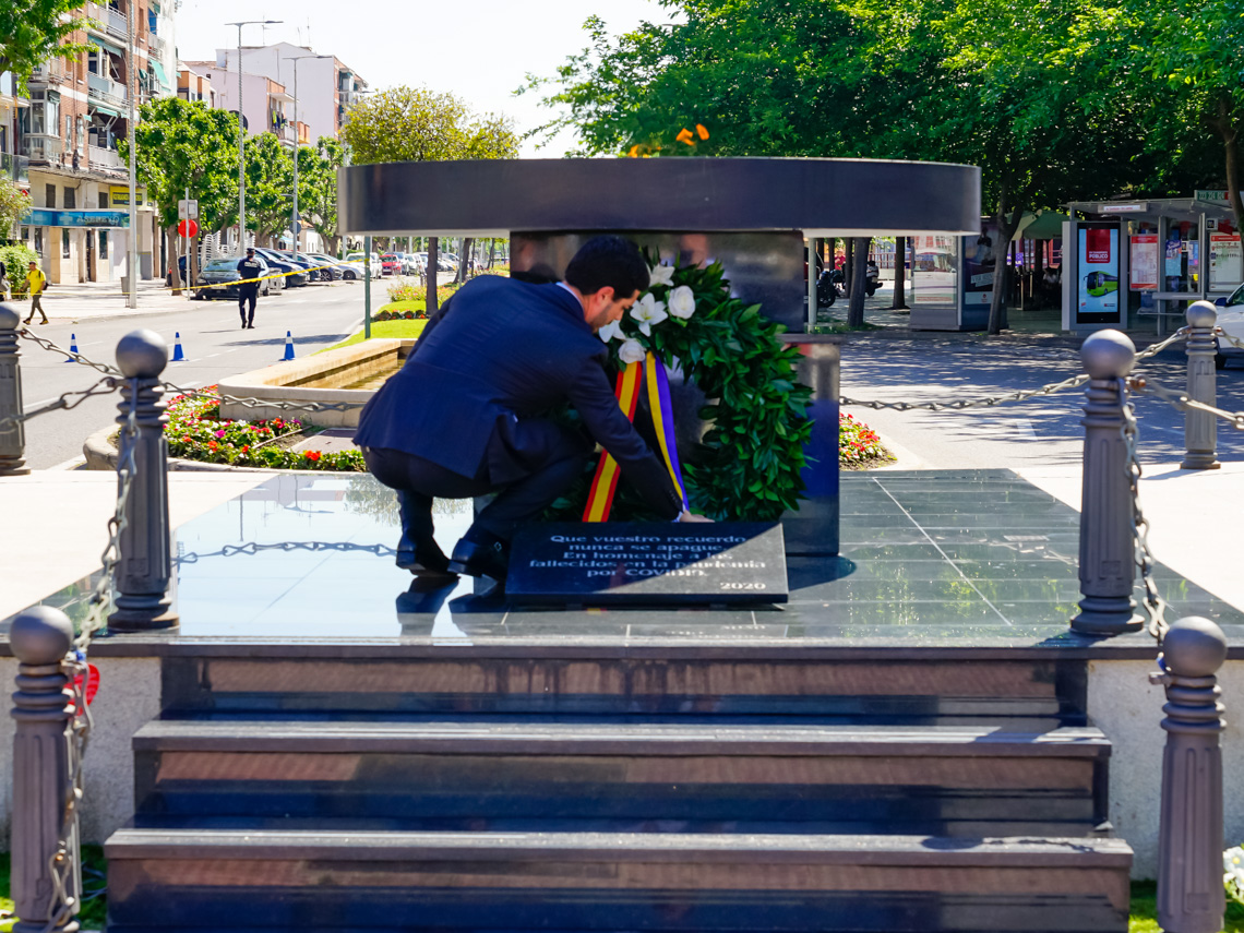 • El sentido homenaje comenzó con un minuto de silencio y una ofrenda de una corona de laurel por parte del alcalde, Alejandro Navarro Prieto, en nombre de la ciudad de Torrejón de Ardoz, a la que siguieron las ofrendas florales realizadas por los portavoces de los grupos políticos representados en el Ayuntamiento, entre otras autoridades, los familiares de las víctimas, las asociaciones de la localidad y los vecinos fueron los protagonistas de este acto en el que también sonaron algunas de las canciones más representativas de la pandemia