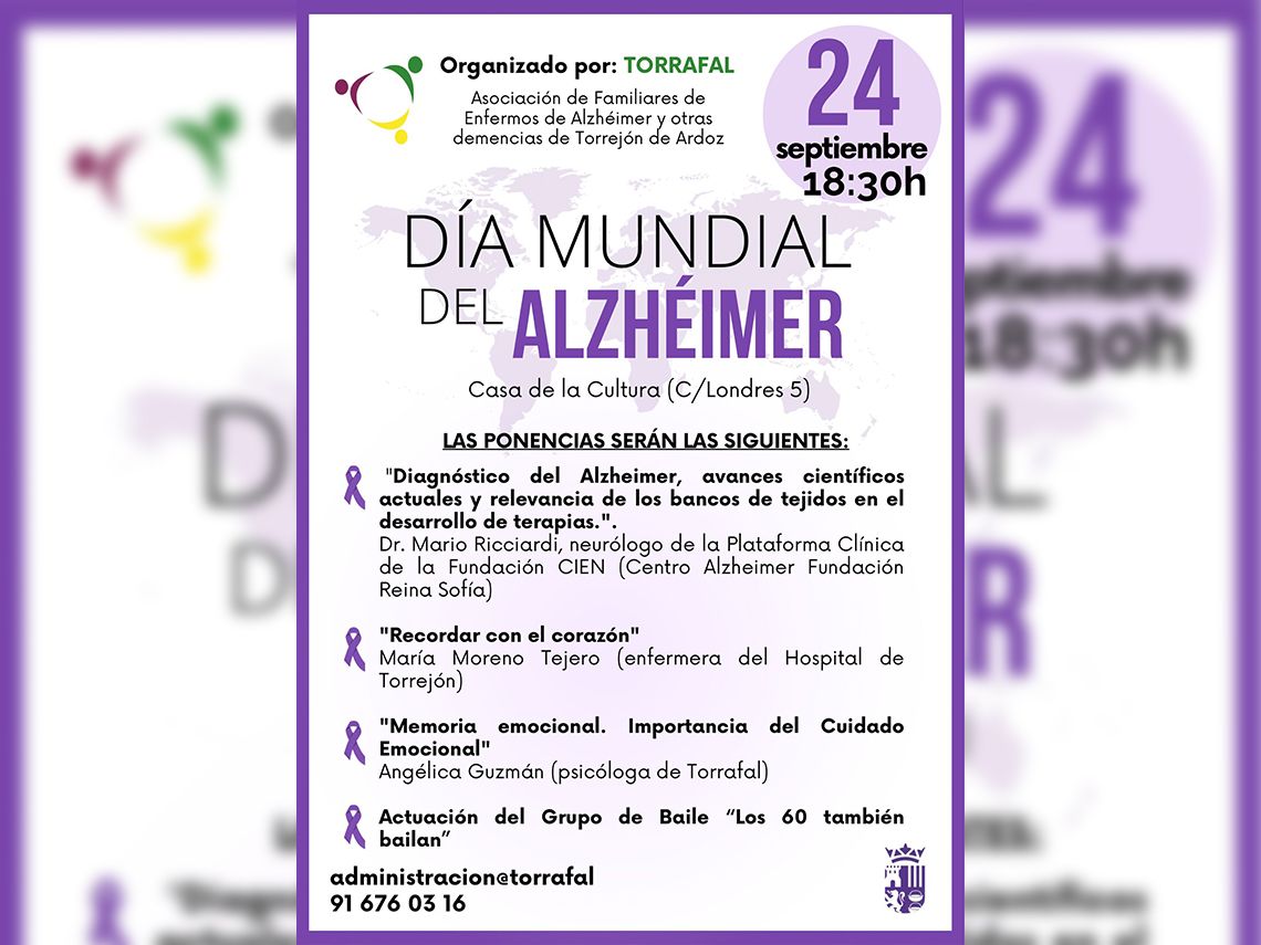 • También, este miércoles, 24 de septiembre, a partir de las 18:30 horas, en el Salón de Actos de la Casa de la Cultura, tendrán lugar las charlas, “Diagnóstico del Alzheimer, avances científicos actuales y relevancia de los bancos de tejidos en el desarrollo de terapias”, a cargo de Mario Riccardi, neurólogo de la Plataforma Clínica de la Fundación CIEN (Centro Alzheimer Fundación Reina Sofía); “Recordar con el corazón”, impartida por María Moreno, enfermera del Hospital Universitario de Torrejón y “Memoria emocional. Importancia del cuidado emocional” por Angélica Guzmán, psicóloga de Torrafal. Una jornada que finalizará con la actuación Grupo de Baile “Los 60 también bailan”
