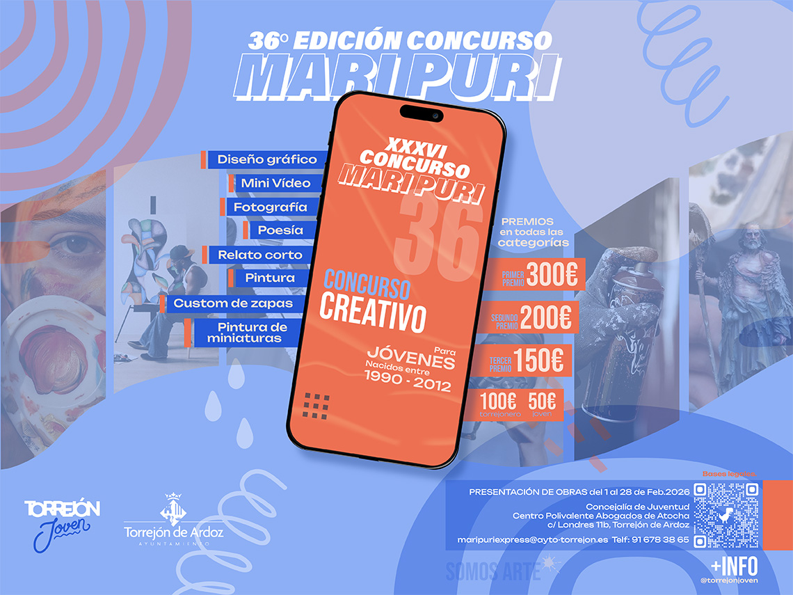 Hasta mañana, sábado, 28 de febrero, permanecerá abierto el plazo de inscripción del XXXVI Concurso Mari Puri Express, que este año llega con una importante novedad en su trayectoria, incorporando la modalidad de diseño gráfico, que responde directamente a la demanda de los jóvenes que solicitaban incluir esta categoría. De esta forma, se suma a las disciplinas tradicionales de fotografía, poesía, relato corto, mini video, pintura, customización de zapatillas y pintura de miniaturas. Las obras podrán presentarse en la Concejalía de Juventud, situada en el Centro Polivalente Abogados de Atocha (calle Londres 11-B) y a través del correo maripuriexpress@ayto-torrejon.es. Más información en el teléfono: 91 678 38 65 y PULSANDO AQUÍ.